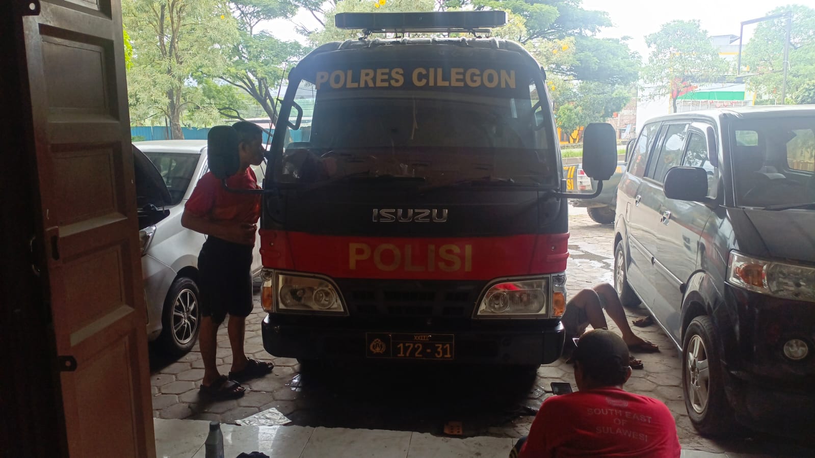 Cilegon Polres cilegon Polda Banten Staf Logistik melakukan pengecekan perawatan kendaraan dinas roda 2 yang sedang di lakukan perawatan.