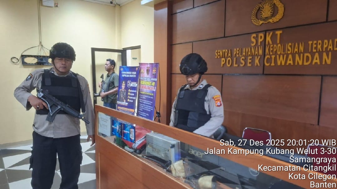Cilegon - Guna mengantisipasi adanya potensi ancaman dan gangguan terhadap keamanan kantor maupun keselamatan personel piket jaga, Personil Polsek Ciwandan Polres Cilegon Polda Banten selalu tingkatkan kesiapsiagaan dan kewaspadaan dengan rutin menggelar kegiatan Sistem Pengamanan Mako (Sispam Mako), Sabtu (27/12/2025).