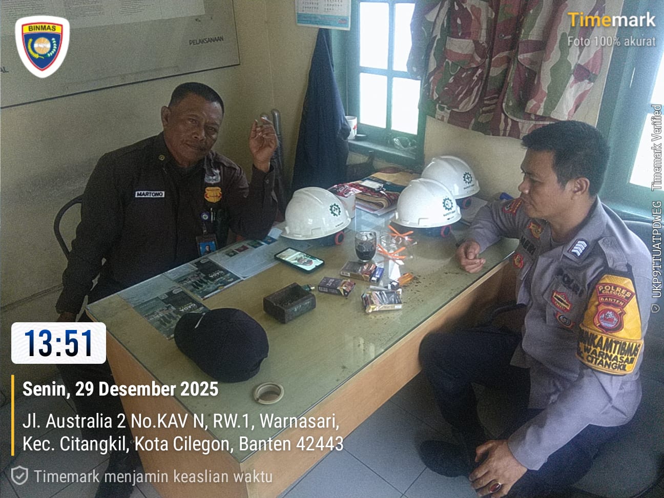 Cilegon - Bhabinkamtibmas Polsek Ciwandan Polres Cilegon Polda Banten Bangun Kemitraan Kamtibmas Dan Datangi Petugas security Meminta Agar Dapat Membantu Tugas-tugas Polri Dalam Menjaga Harkamtibmas, Senin (29/12/2025).