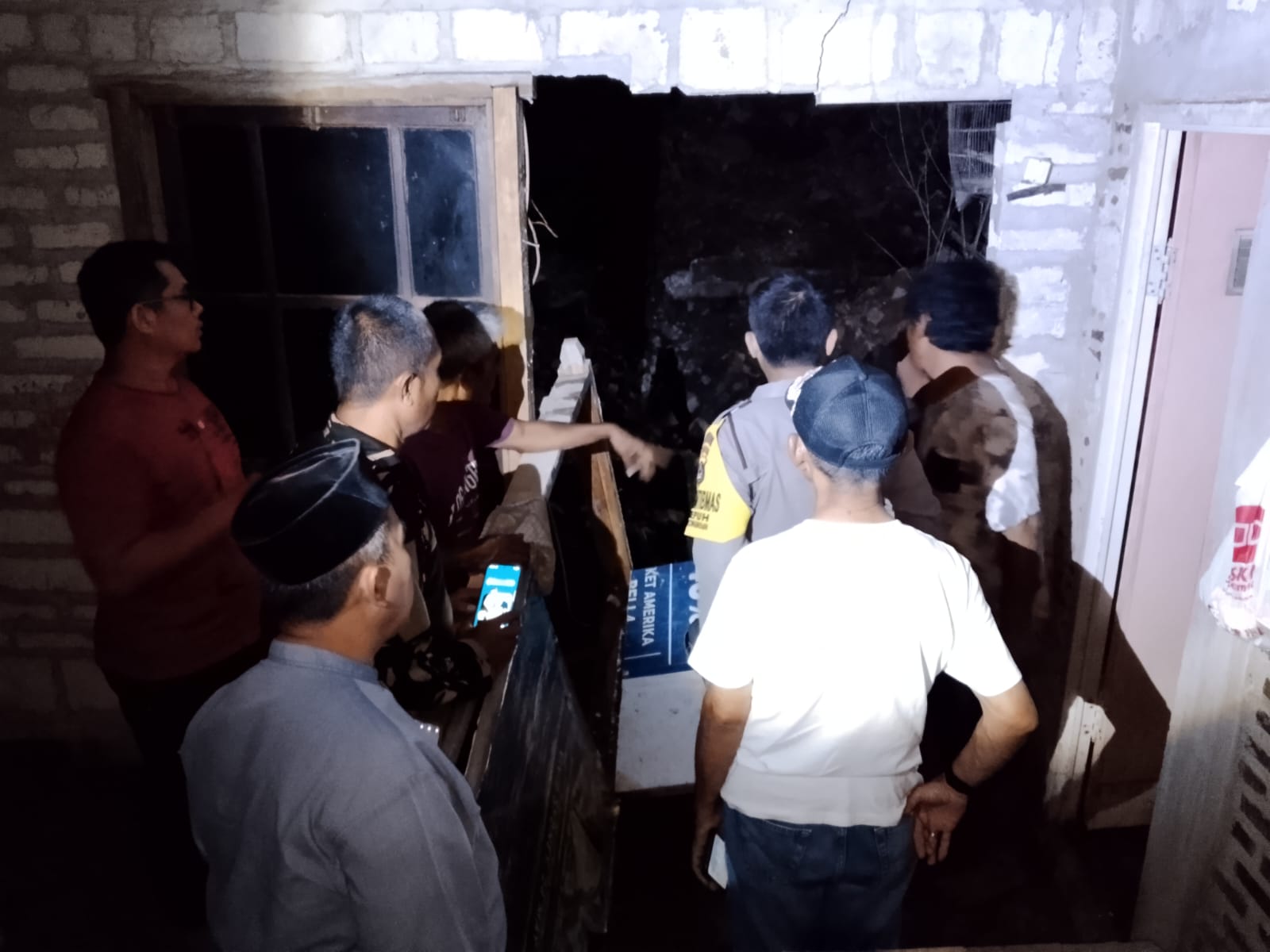 Cilegon - Bhabinkamtibmas, Babinsa Kel. Kepuh, Ketua LSM Ampuh, dan Lurah Kepuh melakukan pengecekan tembok belakang rumah warga dan gubung usaha di Link. Rombongan RT. 01/01 Kel. Kepuh, Ciwandan, Cilegon. Tembok rumah roboh tertimpa pondasi PT. KENERTEK POWER SISTEM pasca banjir pada Senin (05/01/2026).