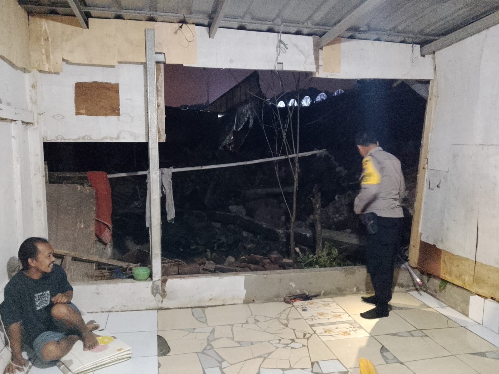 Cilegon - Bhabinkamtibmas, Babinsa Kel. Kepuh, Ketua LSM Ampuh, dan Lurah Kepuh melakukan pengecekan tembok belakang rumah warga dan gubung usaha di Link. Rombongan RT. 01/01 Kel. Kepuh, Ciwandan, Cilegon. Tembok rumah roboh tertimpa pondasi PT. KENERTEK POWER SISTEM pasca banjir pada Senin (05/01/2026).