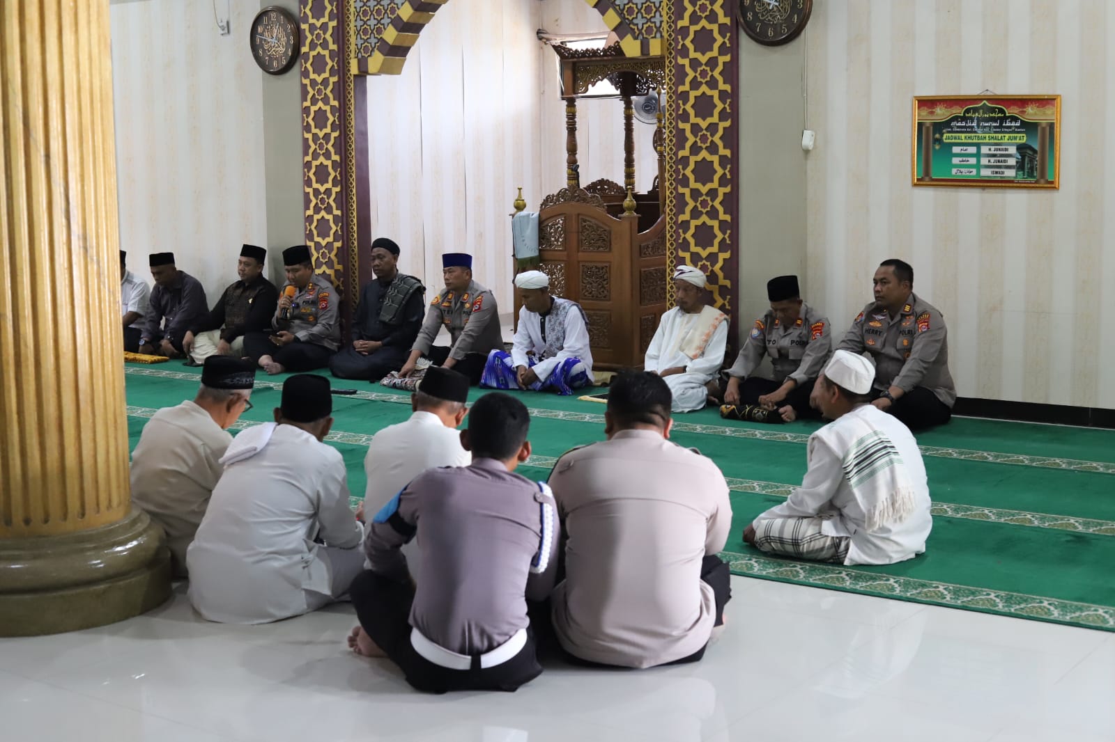 Rangkaian kegiatan diawali dengan pelaksanaan salat Jumat berjamaah. Usai salat, Kapolres Cilegon menyampaikan sambutan dan pesan kamtibmas kepada jamaah. Dalam arahannya, Kapolres menegaskan bahwa Jumat Keliling menjadi sarana penting bagi Polri untuk hadir langsung di tengah masyarakat, memperkuat hubungan emosional, serta menyerap informasi dan aspirasi warga secara langsung.