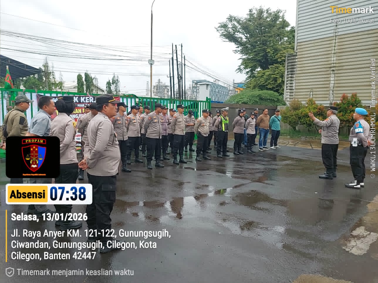 Selasa (13/01/2026) Polres Cilegon melaksanakan pengamanan aksi unjuk rasa (unras) di PT. Dongjin Indonesia, Cilegon, pada hari ini. Aksi unjuk rasa ini dilakukan oleh sekelompok buruh yang menuntut perbaikan kondisi kerja dan upah yang lebih baik.