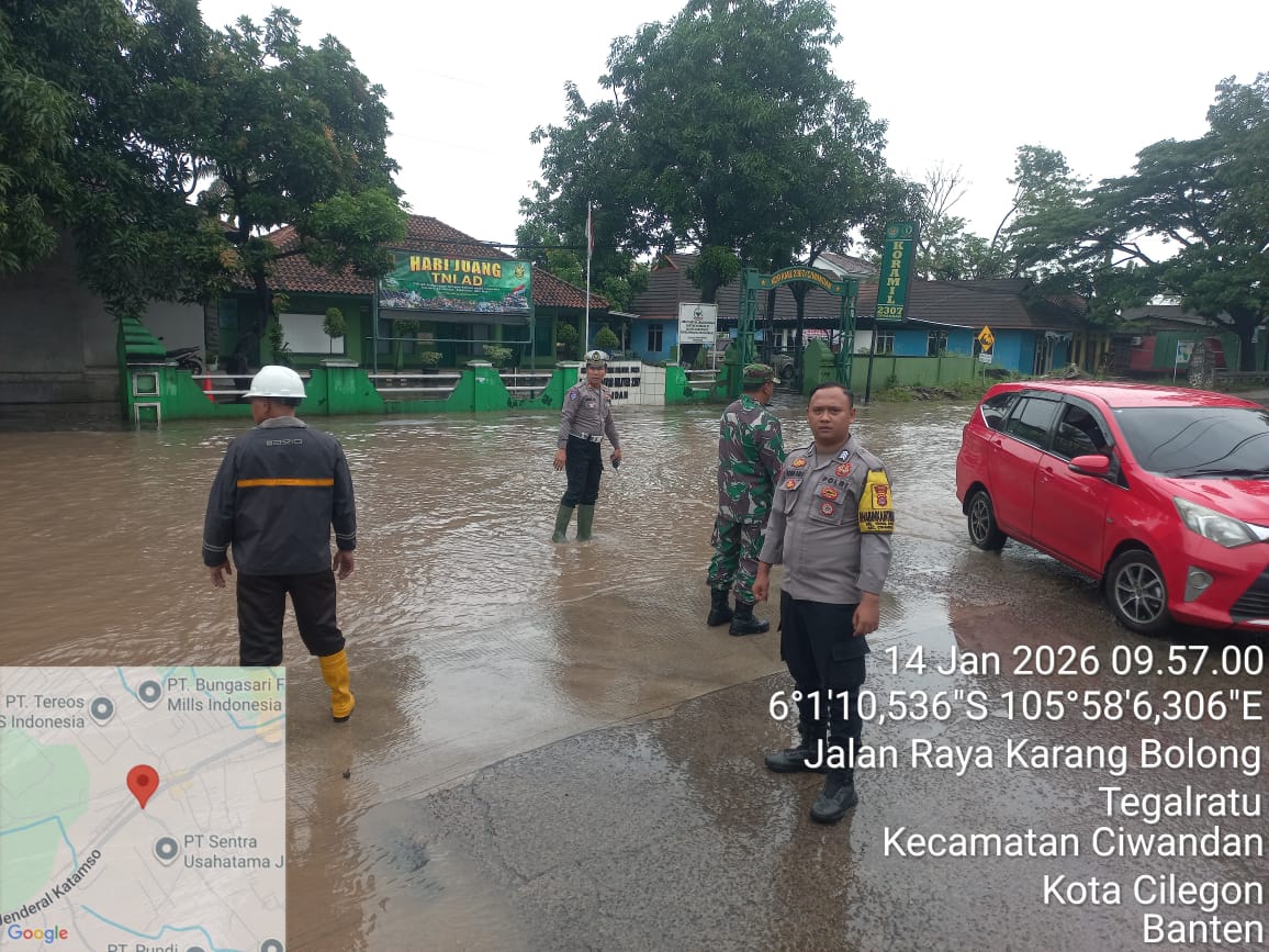 Cilegon - Personil Polsek Ciwandan melaksanakan monitoring genangan air dampak cuaca hujan lebat di wilayah hukum Polsek Ciwandan, Rabu (14/01/2026).