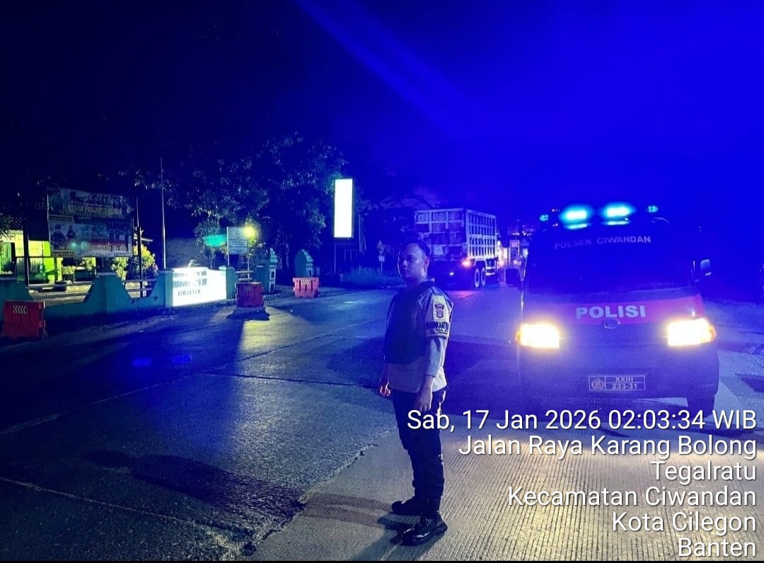 Cilegon - Personil Polsek Ciwandan Polres Cilegon Polda Banten Dalam Pelaksanaan Kegiatan Patroli dengan menyalakan lampu rotator berwarna biru di Daerah Hukum Polsek Ciwandan Polres Cilegon Polda Banten dari malam hingga dini hari, dalam rangka menciptakan situasi aman dan kondusif, Sabtu (17/01/2026).