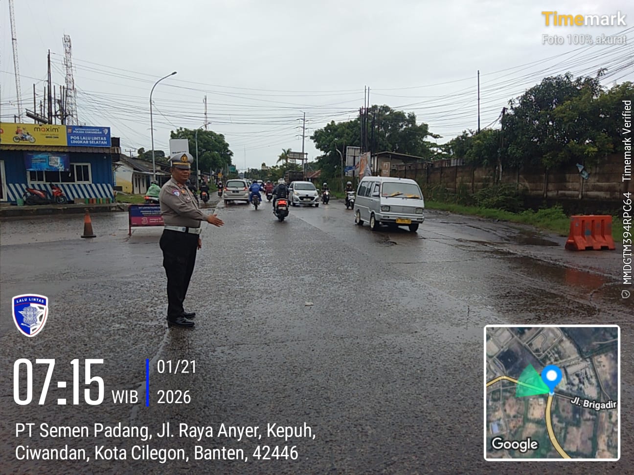 Cilegon - Dalam Mewujudkan Aksi Nyata Pelayanan Kepada Masyarakat,Personil Polsek Ciwandan Polres Cilegon Polda Banten Laksanakan Strong Poin Pengaturan Lalu-lintas,Selasa  (20/01/2026).