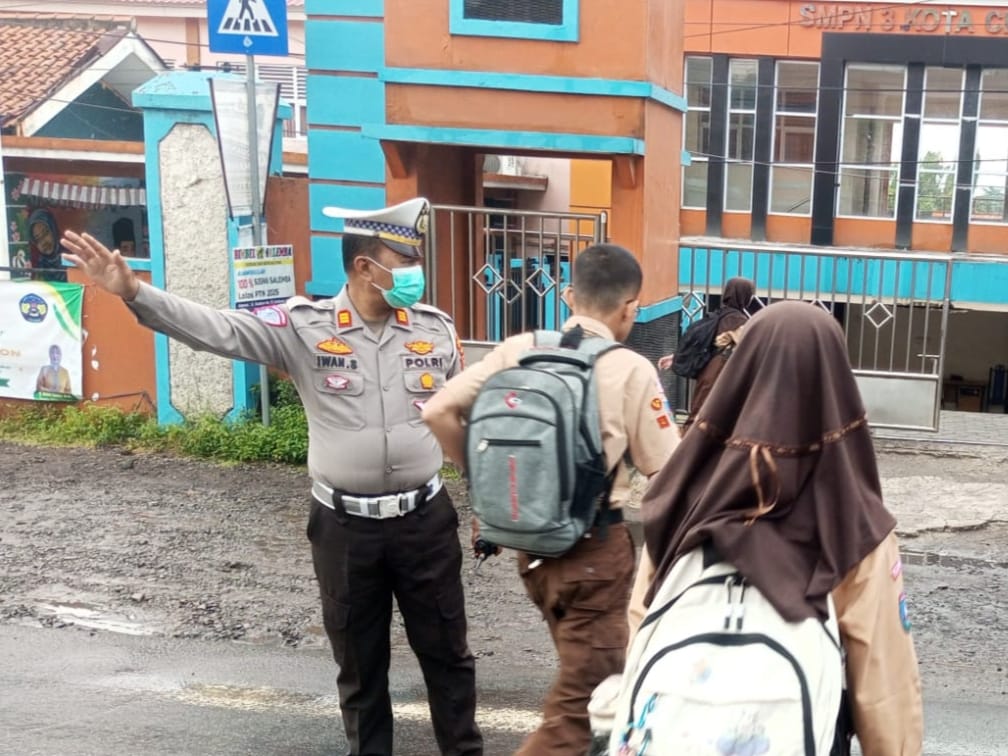 Meskipun saat hujan !!! Kanit Lantas Polsek Pulomerak Bantu atur lalin di depan SMP 3 Cilegon