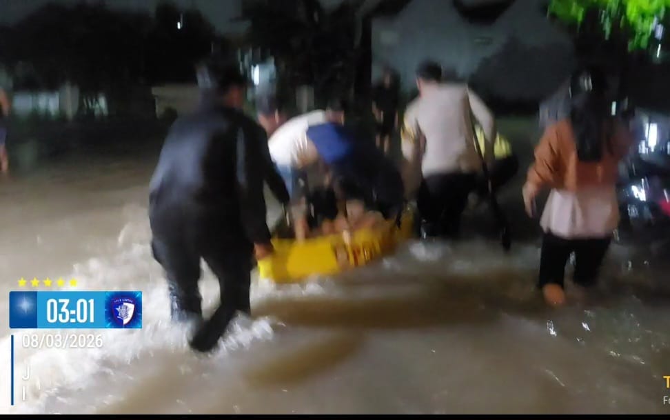 Polres Cilegon evakuasi warga yang terdampak genangan di Perumahan Metro Cilegon. . Minggu, 8/03/2026