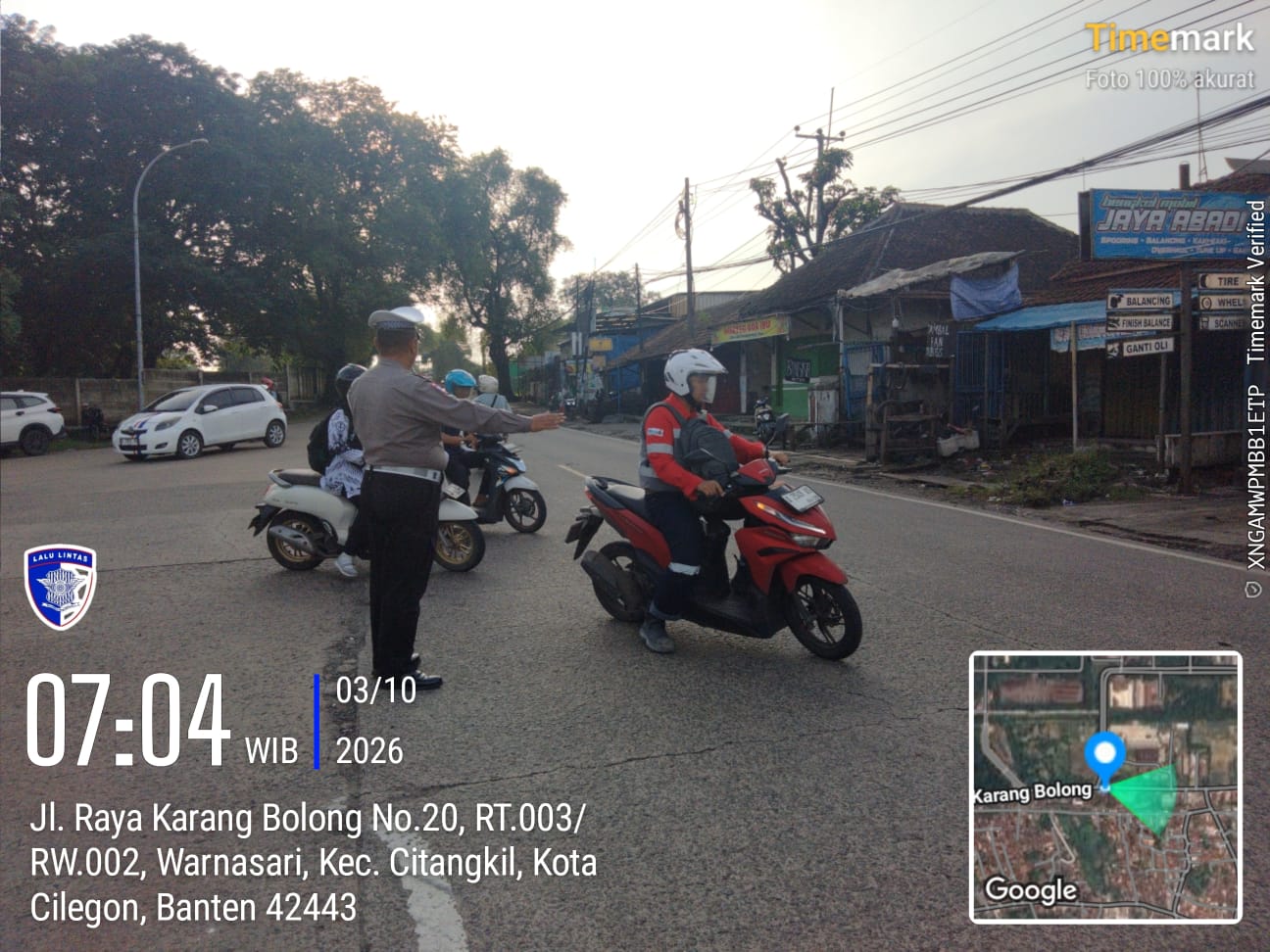 Cilegon - Guna Kelancaran Lalu-lintas Personil Unit Lantas Polsek Ciwandan Polres Cilegon Polda Banten melaksanakan pengaturan lalu-lintas di Simpang Beringin Ciwandan Pertigaan Kawasan Industri KSP/ KIEC I kelurahan Warnasari Kecamatan Citangkil Kota Cilegon, Senin (09/03/2026).